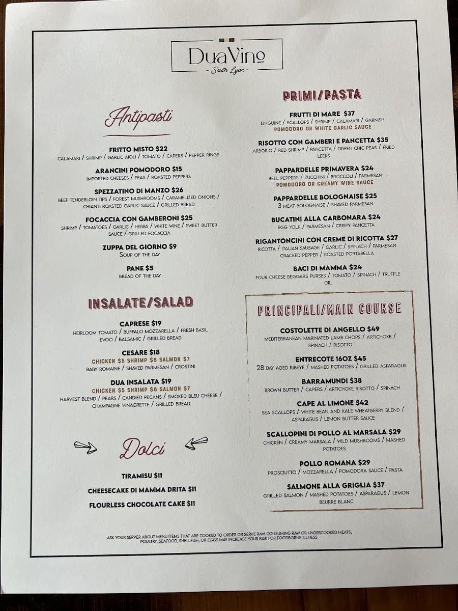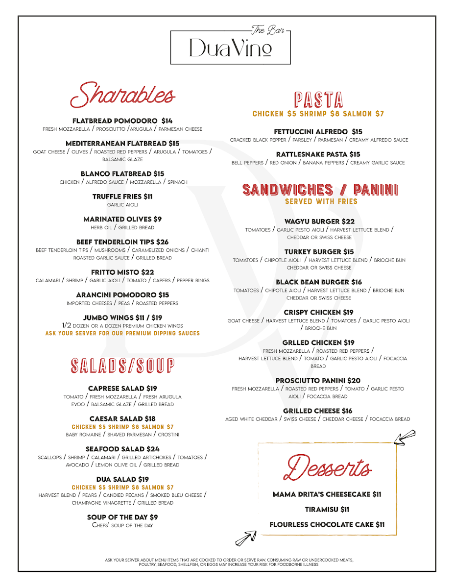 Overall, Dua Vino + The Bar’s menu is an exciting blend of flavors that cater to various tastes and preferences, ensuring there’s something for everyone.