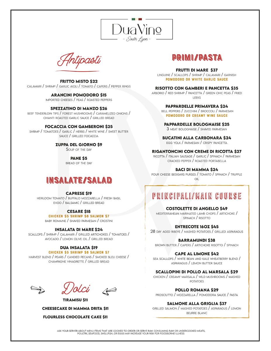 The menu at Dua Vino + The Bar offers a wide range of delicious dishes and drinks that reflect the restaurant's commitment to providing a memorable dining experience. For those who enjoy a good glass of wine, there’s a carefully curated selection of Wine that pairs perfectly with the food. The appetizers include favorites like Arancini Pomodoro, crispy rice balls stuffed with cheese and served with a rich tomato sauce, and Truffle Fries, crispy fries topped with truffle oil and parmesan.
